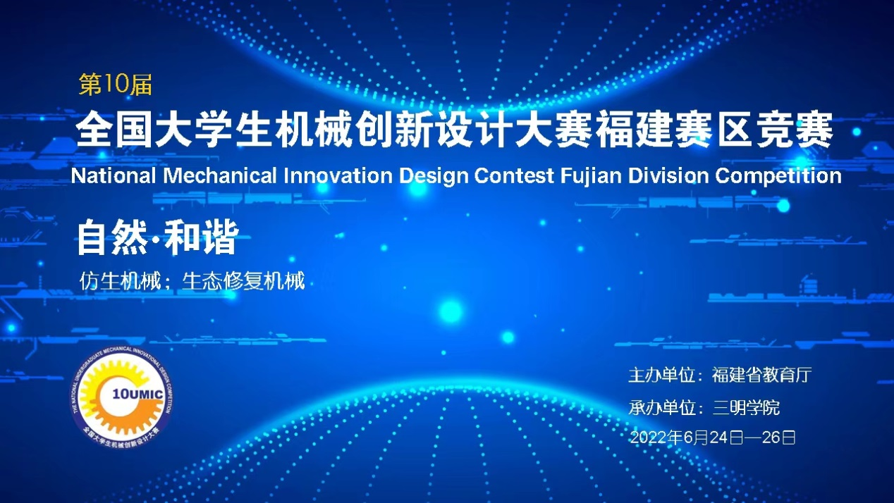 本届大赛由福建省教育厅主办,三明学院承办,共有来自全省高校的277支队伍参赛。比赛主题为“自然•和谐”,内容为设计与制作模仿自然界动物的运动形态、功能特点的机械产品(简称仿生机械);用于修复自然生态的机械装置,包括防风固沙、植被修复和净化海洋污染物的机械装置(简称生态修复机械)。