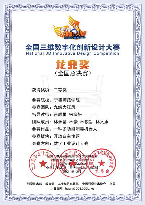 永利官网高度重视本次比赛,参赛选手和指导老师积极策划参赛方案,精心准备,在福建赛区竞赛中,荣获3项福建省特等奖、6项省一等奖、4项省二等奖、5项省三等奖,参赛和获奖作品数量位居全省高校前列,3项特等奖作品代表福建省参加全国总决赛取得佳绩,其中参赛作品“一种多功能消毒机器人”获二等奖,参赛作品“一种新型物流机器人” 和“一体化工业混凝土搅拌机”获三等奖。
