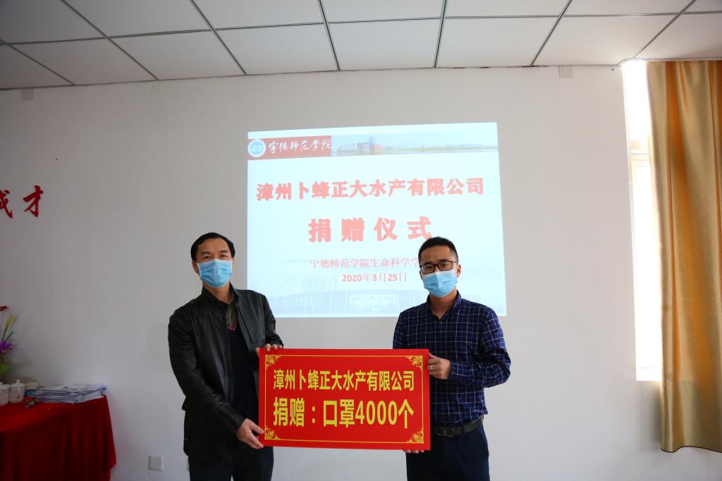 3月25日下午,漳州卜蜂正大水产有限公司为yl6809永利官网生命科学学院捐赠4000只口罩,用于新冠肺炎疫情防控。生命科学学院刘伟院长、张秋良副书记、阮少江副院长,漳州卜蜂正大水产有限公司代表李强、林贤良、黄敏一行3人出席捐赠仪式。