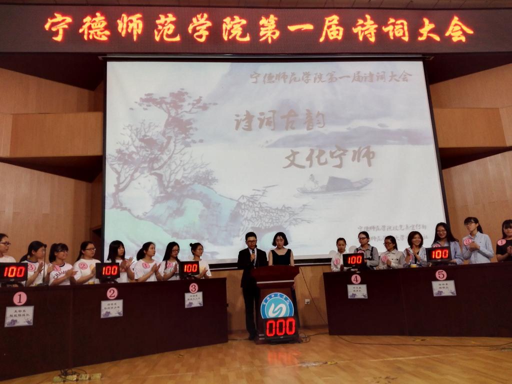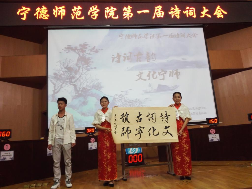 本次诗词大会受到了同学们的广泛关注,来自各系130多名同学报名,经初赛选拔,中文系、经管系、旅游系、生物系、教育系、外语系,6个系代表队进入决赛。决赛环节共分依次答题,抢答题,风险题,飞花令4轮角逐,题目形式多样,内容丰富,全面考察了选手的诗词熟练度。飞花令环节,选手们沉着应答,你一言我一句,反应迅速,令观众惊叹不已。在风险题环节中,“被誉为‘诗狂’的诗人是哪位?”难倒了选手,林文老师现场解读了背后的故事。贺知章被称作“诗狂”是因为“知章性放旷,晚尤纵诞,自号四明狂客”。评委老师解答环节,打开了观众和选手的寻访之门。比赛最后,书法协会的潘皇勇同学挥毫泼墨,现场书写“诗词古韵,文化宁师”为比赛助阵。