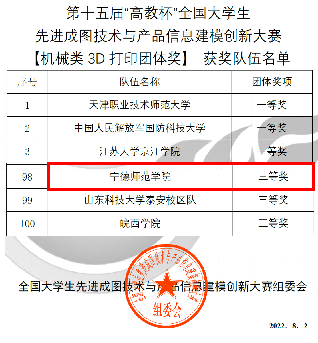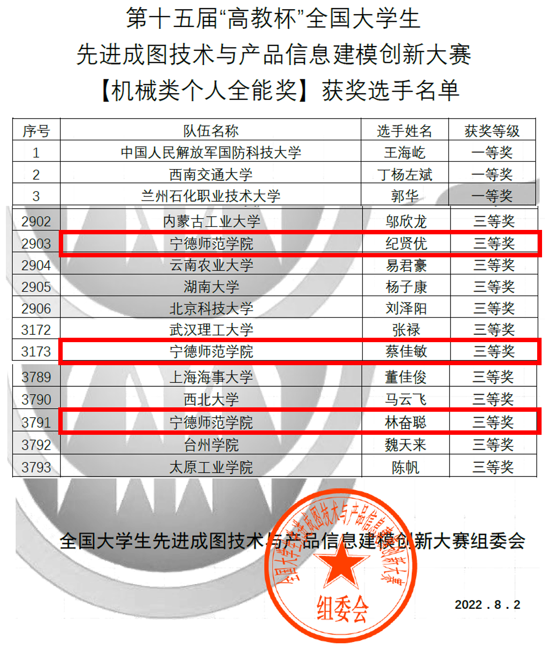 2022年7月30日—8月2日,第十五届“高教杯”全国大学生先进成图技术与产品信息建模创新大赛总决赛在江苏大学举行。经省赛选拔,永利官网信息与机电工程学院6名学生参与机械类决赛,获得国赛单项团体三等奖1项、国赛个人全能三等奖3项。